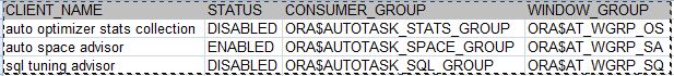 SELECT client_name, status, consumer_group, window_group FROM dba_autotask_client ORDER BY client_name;